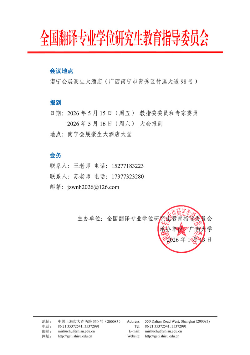 全国翻译教指委2026年工作会议暨全国翻译专业学位研究生教育2026年年会(一号通知)